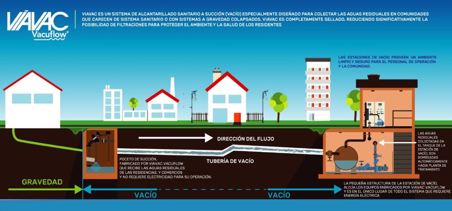 Con Viavac, se instala una estación de vacío la cual recolecta las aguas negras de los inmuebles usando tuberia de polietileno de alta densidad como el medio conductor y unos pocetos para recolectar el agua. Dentro de los pocetos, hay una boya y una válvula mecanica que se acciona cuando el nivel del agua sanitaria dentro del poceto sube y conecta el poceto al sistema de vacio el cual succiona el agua negra y la lleva al tanque de recolección.